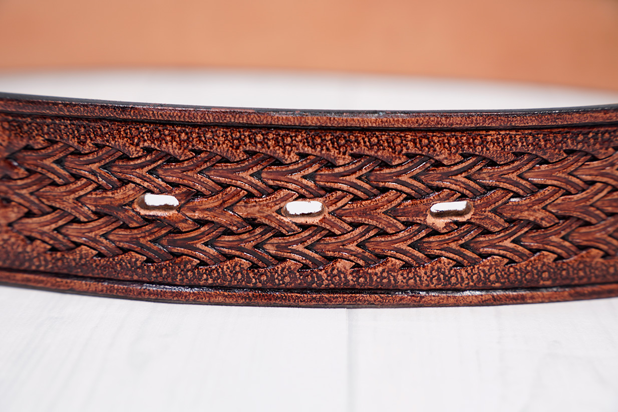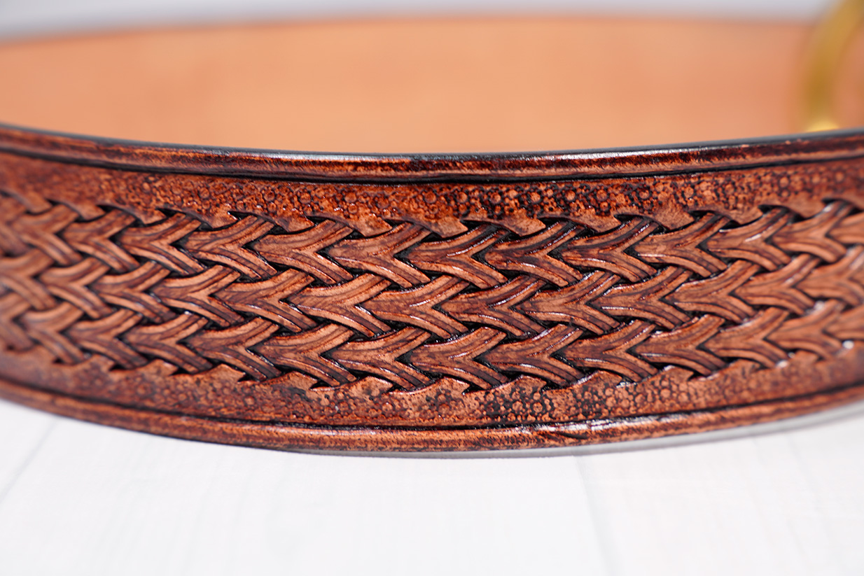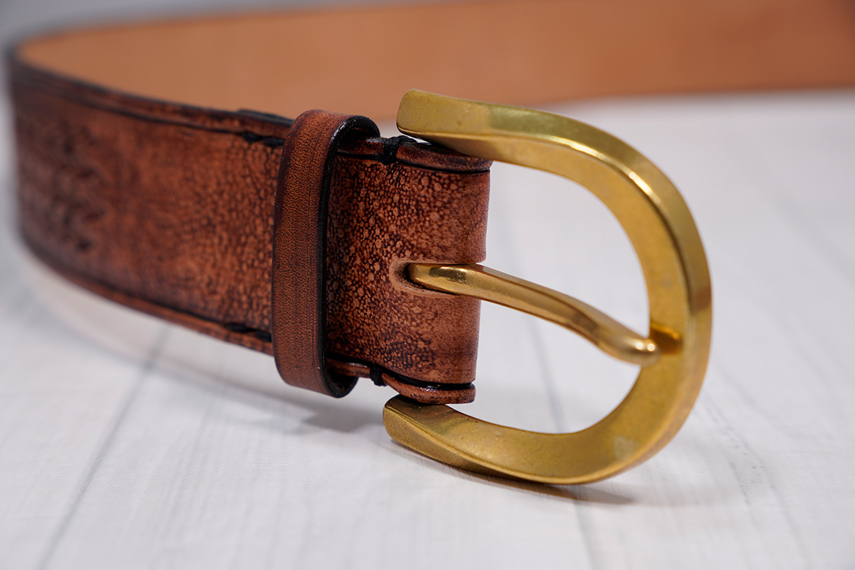 厚み4mm幅39mmのヌメ革にカービングとスタンピングを施したベルト